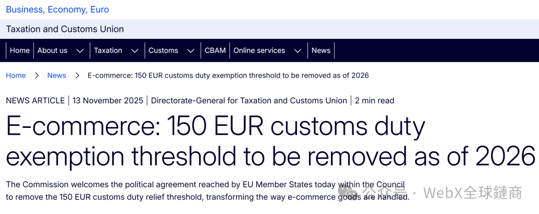 2026年7月1日起,歐盟正式終止“150歐元以下小額包裹關稅豁免”政策,這一變革對直發物流形成直接沖擊。此前,依賴“低價鋪貨、小額直郵”的賣家通過郵政小包或專線物流,利用免稅政策降低成本,但新政實施后,所有非歐盟直郵的B2C小包均需繳納關稅及清關處理費。以過渡期(2026年7月1日至2028年6月30日)為例,每件包裹需支付3歐元/類固定關稅(多品類疊加)及2歐元/件清關費,成本增幅顯著。例如,一件價值50歐元的服裝包裹,若涉及多個品類,綜合稅費可能超過10歐元,直接壓縮利潤空間。